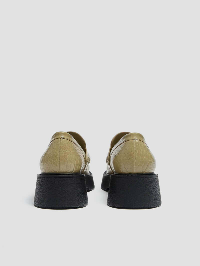 Green flat loafers with an animal print on the upper. Penny strap on the front. Sole height: 4.5 cm.