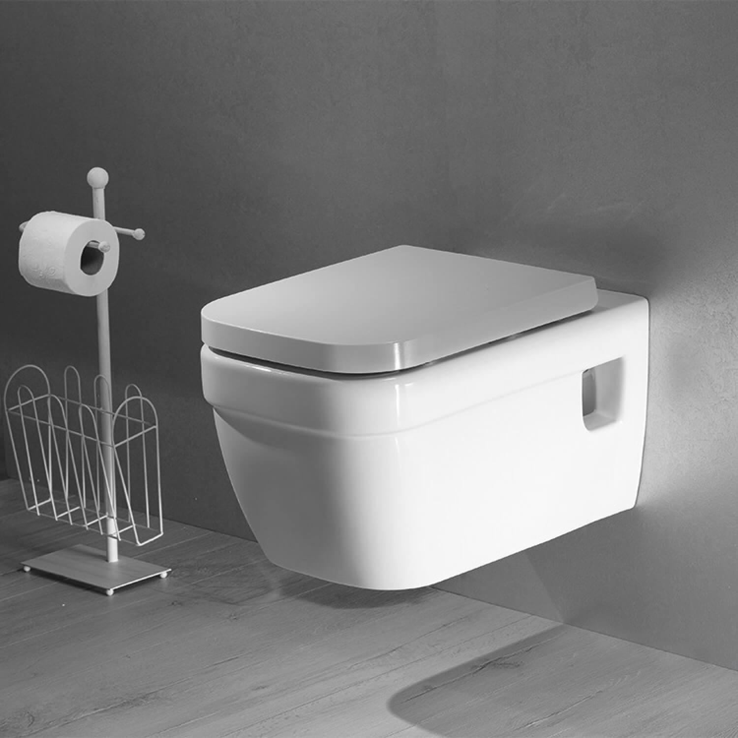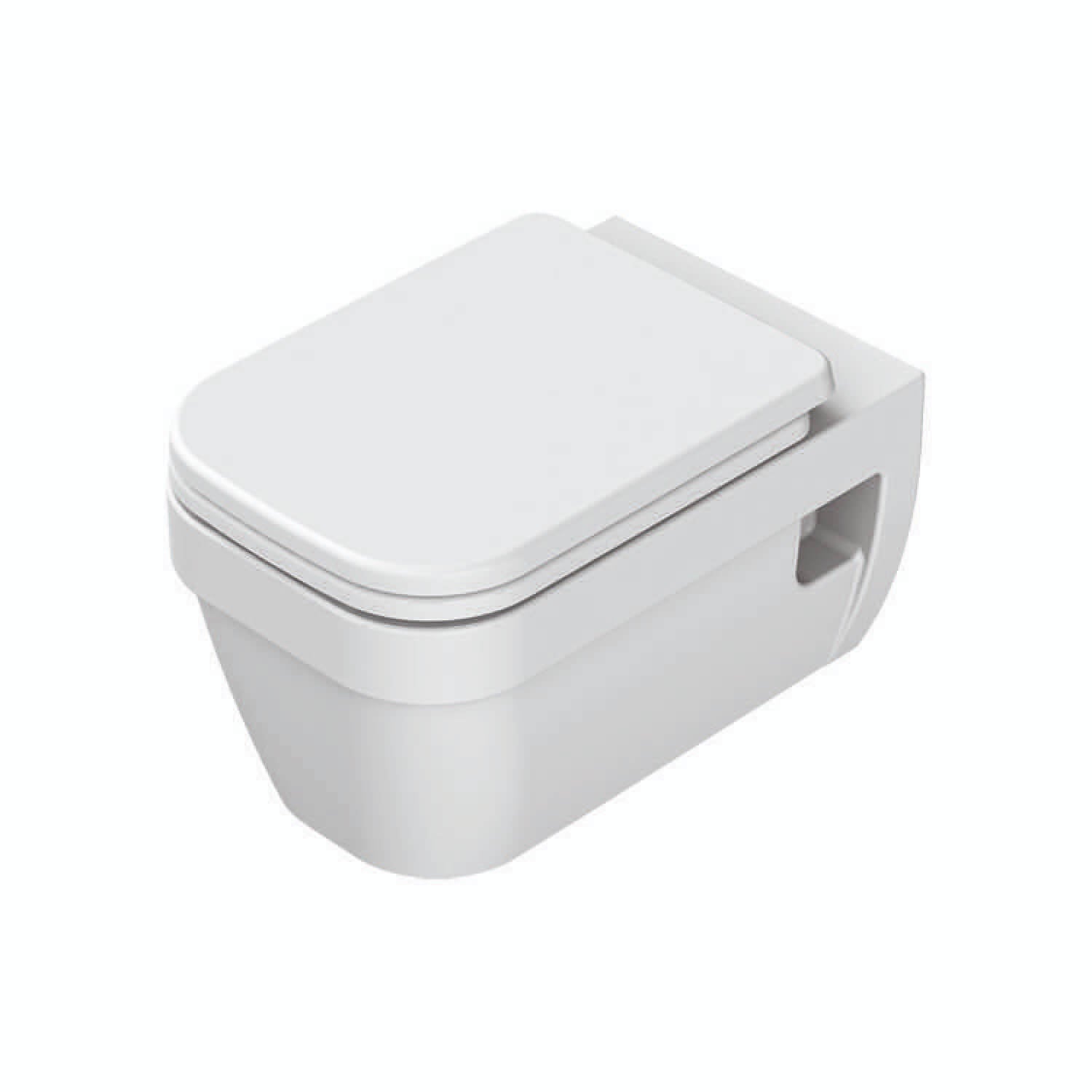 Wall-mounted toilet has a 5 liter cistern capacity with dual flush. Made in ceramic and available in white.